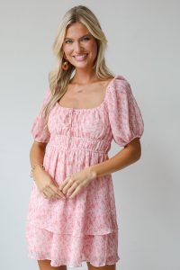 Take your spot as a true icon with the Curated Style Blush Floral Mini Dress! This cute dress is a stunning blend of playful and romantic elements. The soft blush fabric is adorned with delicate floral patterns, creating a fresh and feminine aesthetic. The standout puff sleeves add a touch of drama and vintage-inspired charm, balancing the mini length with a stylish flair. The dress features a flattering silhouette that gently hugs the waist, enhancing your shape while providing comfort. The lightweight fabric drapes beautifully, making it perfect for warm weather occasions. Whether you’re heading to a garden party, a daytime event, or a casual outing, this blush floral puff sleeve mini dress will make you feel effortlessly chic and confident. Pair it with strappy sandals or heels for a complete, fashionable look! Textured Lightweight Woven Knit Fabrication Floral Print Elastic Square Neckline with Faux Tie Short Puff Sleeves with Elastic Cuffs Elastic Waistband Flowy Fit Tiered Hem Short/Mini Length Self + Lining: 100% Polyester Lined Body, Unlined Sleeves Hand Wash Cold, Line Dry Model is 5’6″ and wearing a Small.Garment Measurements in Inches:Small | Bust 32″ | Waist 26″ (Stretches up to 32″) | Hips 44″ | Length 33″Medium | Bust 34″ | Waist 28″ (Stretches up to 34″) | Hips 46″ | Length 34″Large | Bust 36″ | Waist 30″ (Stretches up to 36″) | Hips 48″ | Length 35″