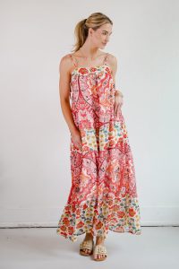 Happy days never have to end now that the Everlasting Bliss Red Floral Maxi Dress has arrived! Featuring a vibrant red backdrop adorned with a delicate floral print, this flowy maxi dress is designed with adjustable tie straps for a customizable fit and a feminine touch. The lightweight fabric and breezy silhouette make it ideal for warm days, beach getaways, or garden parties. Just add sandals and a sunhat for an instantly chic, sun-soaked look! Lightweight Woven Knit Fabrication Floral Print V-Neckline Functional Tie Straps Flowy Tiered Fit Side Pockets Functional Back Buttons + Keyhole Maxi Length Fully Lined Self + Contrast: 100% Polyester Lining: 100% Rayon Hand Wash Cold, Line Dry Model is 5’10” and wearing a Small.Garment Measurements in Inches:Small | Bust 34″ | Waist 40″ | Hips 56″ | Length 52″Medium | Bust 36″ | Waist 42″ | Hips 58″ | Length 53″Large | Bust 38″ | Waist 44″ | Hips 60″ | Length 54″