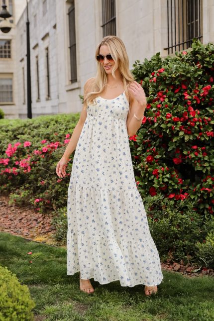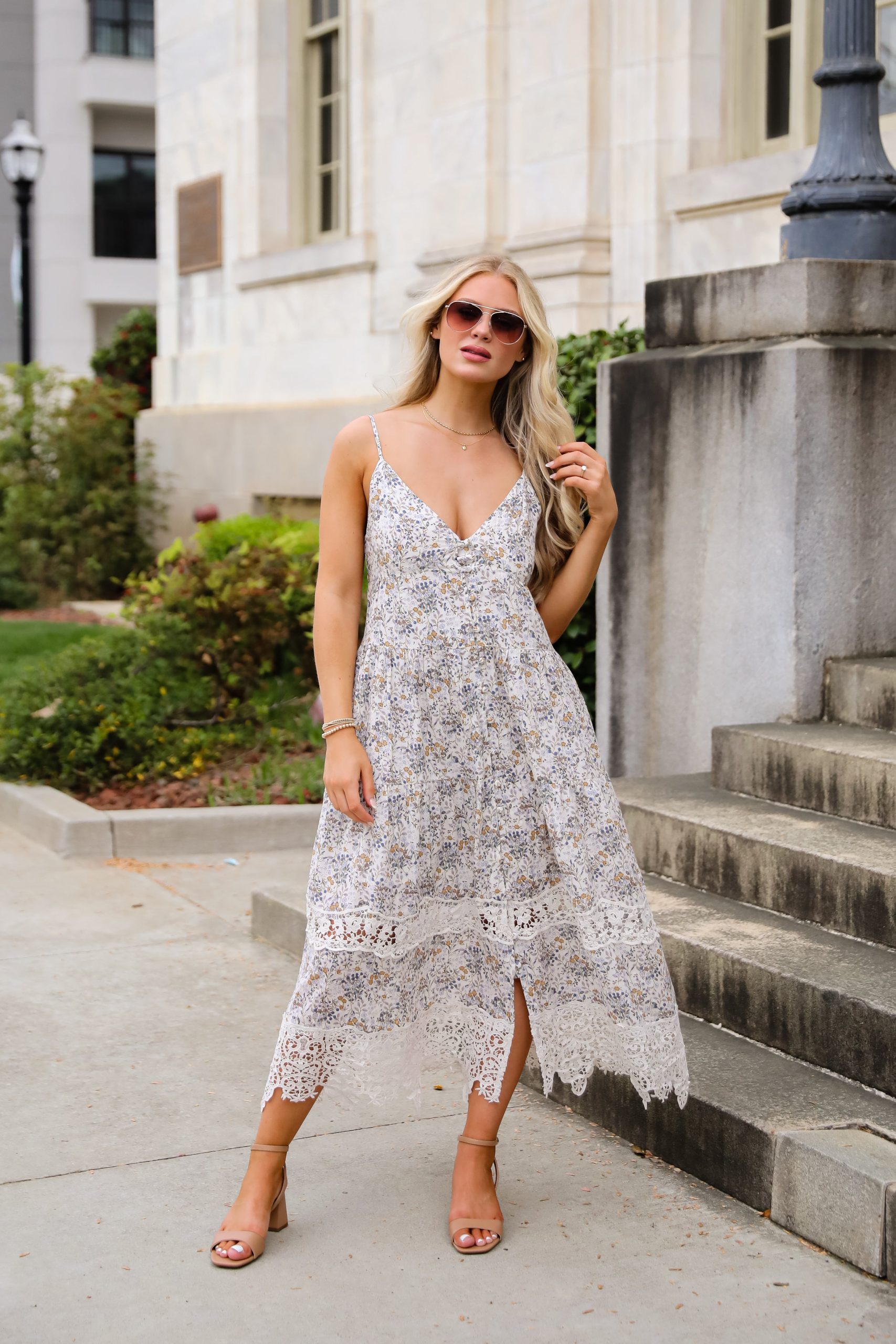 Step into a vacation state of mind with the Feel The Sunshine Ivory Floral Maxi Dress! Adorned with a soft floral print and finished with intricate crochet trim, it blends vintage charm with modern femininity. The lightweight fabric flows beautifully with every step, while the dainty spaghetti straps and relaxed silhouette keep it cool and comfortable. Perfect for summer weddings, weekend getaways, or sunset strolls, this maxi dress is your go-to for looking effortlessly put-together! Lightweight Cotton-Blend Fabrication Floral Print V-Neckline Spaghetti Straps that Tie in the Back Functional Button Front Flowy Tiered Fit Crochet Trim Front Slit Maxi Length Fully Lined Self: 66% Cotton, 34% Rayon Lining: 100% Cotton Hand Wash Cold, Hang Dry Model is 5’6″ and wearing a Small.Garment Measurements in Inches:Small | Bust 32″ | Waist 32″ | Hips 48″ | Length 53″Medium | Bust 34″ | Waist 34″ | Hips 50″ | Length 54″Large | Bust 36″ | Waist 36″ | Hips 52″ | Length 55″