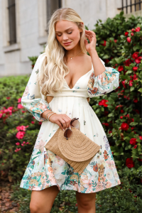Every sunny day is a perfect reason to romp around in the Flouncin’ Around Cream Floral Mini Dress! Featuring a romantic sweetheart neckline with built-in padding for a flattering, secure fit, it beautifully highlights your shape. The 3/4 length sleeves add a soft, elegant touch, while waist cutouts bring a modern, playful twist to the classic floral print. Perfect for brunch dates, garden parties, or a night out, this mini dress blends sweet and sultry in all the right ways! Lightweight Woven Knit Fabrication Floral Print Sweetheart Neckline Padding Included Elastic Shoulders 3/4 Length Balloon Sleeves with Elastic Cuffs Cutouts on the Waist Flowy Fit Smocked Back Open Back with Functional Tie Short/Mini Length Lined Body, Unlined Sleeves Self: 100% Polyester Lining: 100% Cotton Hand Wash Cold, Hang or Line Dry Model is 5’6″ and wearing a Small.Garment Measurements in Inches:Small | Bust 32″ | Waist 26″ | Hips 50″ | Length 34″Medium | Bust 34″ | Waist 28″ | Hips 52″ | Length 35″Large | Bust 36″ | Waist 30″ | Hips 54″ | Length 36″