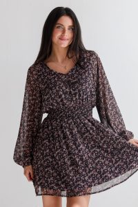 Feel like royalty all night long with an exquisite look like the High-Class Attitude Navy Floral Mini Dress! This enchanting dress features a rich navy backdrop adorned with a vibrant floral print, bringing a fresh, romantic touch to your wardrobe. The long sleeves add elegance and warmth, making it perfect for transitional seasons. With a flattering fit-and-flare silhouette, this mini dress accentuates your figure while allowing for easy movement. Pair it with ankle boots for a casual outing or dress it up with heels for a night out. Effortlessly chic and endlessly versatile, this dress is a must-have for any fashion-forward woman! Lightweight Woven Knit Fabrication Floral Print V-Neckline Long Balloon Sleeves with Elastic Cuffs Elastic Waistband Flowy Fit Short/Mini Length Lined Body, Unlined Sleeves Self + Lining: 100% Polyester Hand Wash Cold, Hang or Line Dry Model is 5’4″ and wearing a Small.Garment Measurements in Inches:Small | Bust 34” | Waist 22” (Stretches up to 34″) | Hips 46” | Length 33”Medium | Bust 36” | Waist 24” (Stretches up to 36″) | Hips 48” | Length 34”Large | Bust 38” | Waist 26” (Stretches up to 38″) | Hips 50” | Length 35”X-Large | Bust 40” | Waist 28” (Stretches up to 40″) | Hips 52” | Length 36”