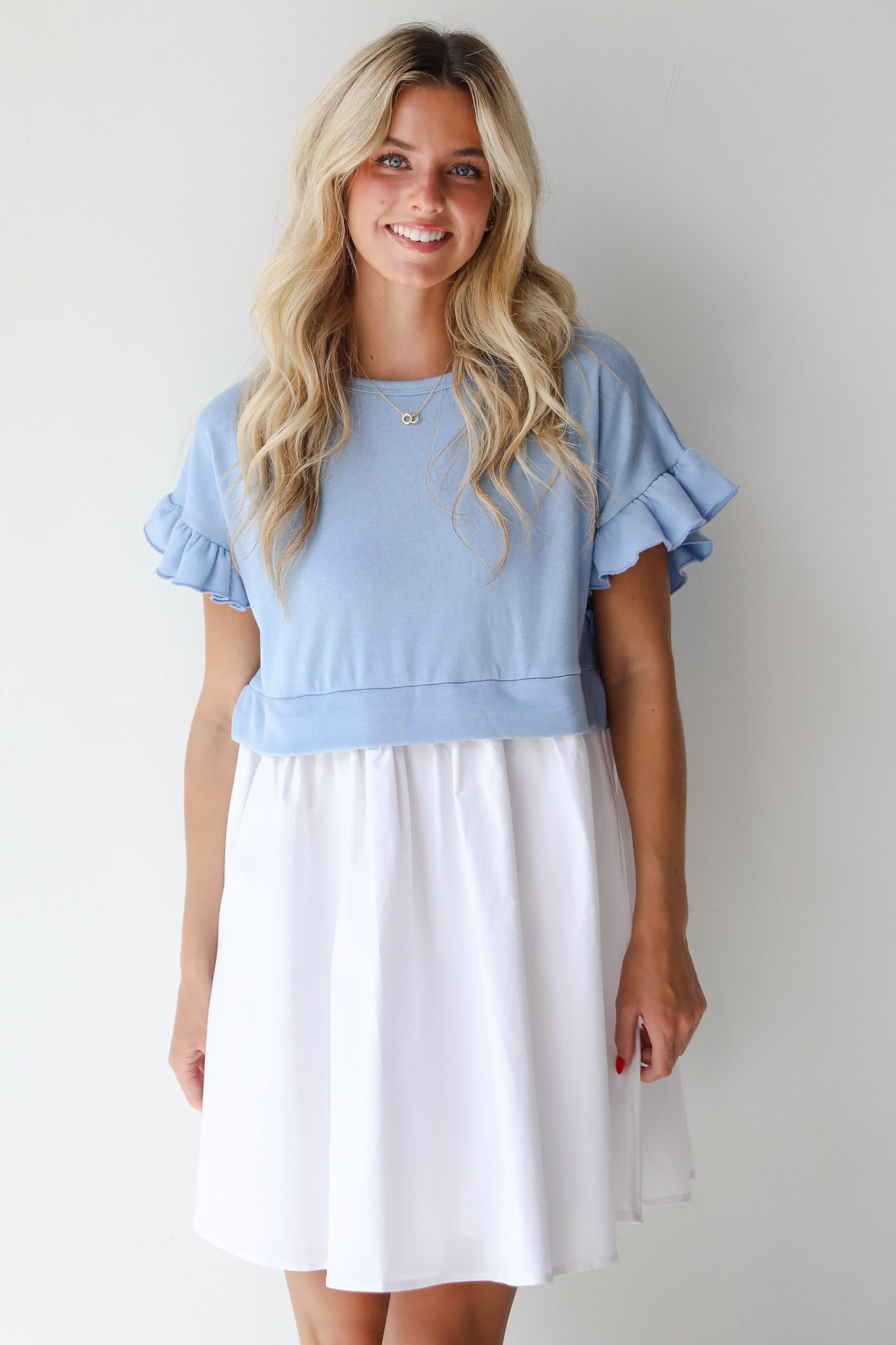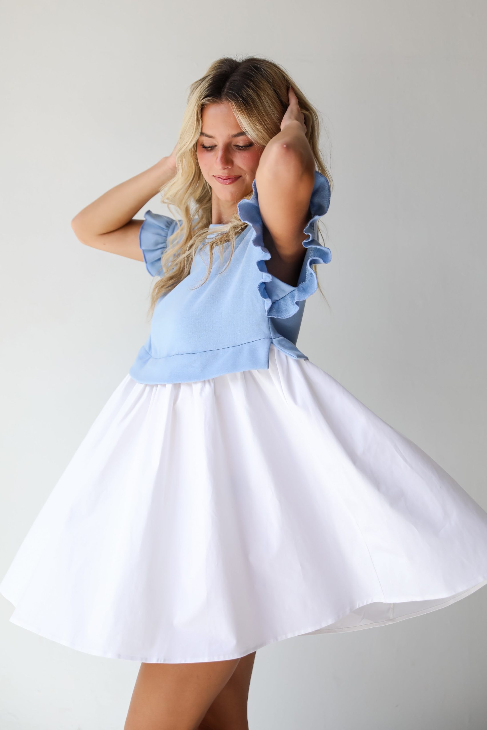 The Thriving Sweetness Blue Contrast Mini Dress is ready to be your favorite styling companion this season! This eye-catching dress is designed to offer a fresh and stylish look with its contrasting color scheme and flattering silhouette. Featuring a crisp blue and white contrast design, the dress highlights a classic combination of colors that creates a vibrant and chic appearance. Pair it with sandals for a relaxed daytime look, or elevate it with heels and accessories for a more polished ensemble! Soft + Stretchy French Terry Knit Upper Lightweight Cotton Skirt Rounded Neckline Short Ruffle Sleeves Oversized Babydoll Fit Short/Mini Length Made in the USA Self: 70% Polyester, 30% Cotton Skirt: 97% Cotton, 3% Spandex Machine Wash Cold, Tumble Dry Low Model is 5’6″ and wearing a Small.Garment Measurements in Inches:Small | Bust 48″ | Waist 42″ | Hips 60″ | Length 34″Medium | Bust 50″ | Waist 44″ | Hips 62″ | Length 35″Large | Bust 52″ | Waist 46″ | Hips 64″ | Length 36″